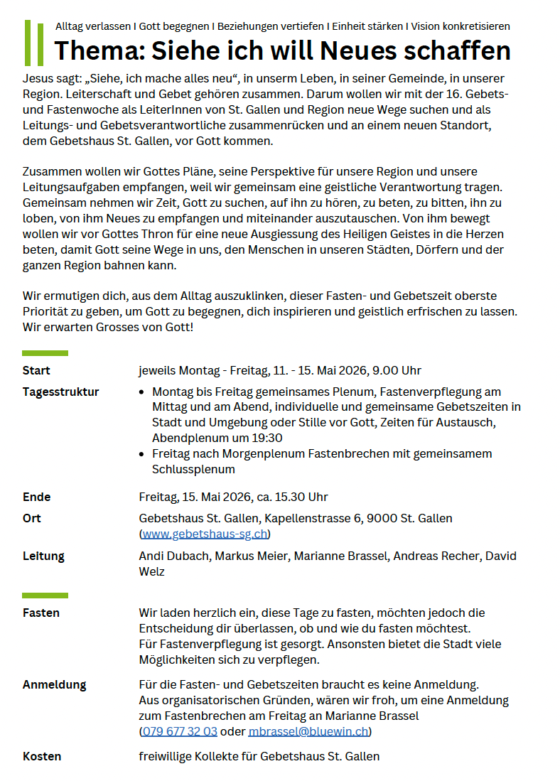 Erhalte Neuigkeiten vom Gebetshaus St. Gallen direkt in dein E-Mail Postfach. Wir verschicken 2-3 Newsletter im Jahr.